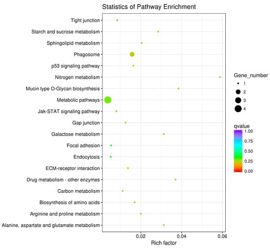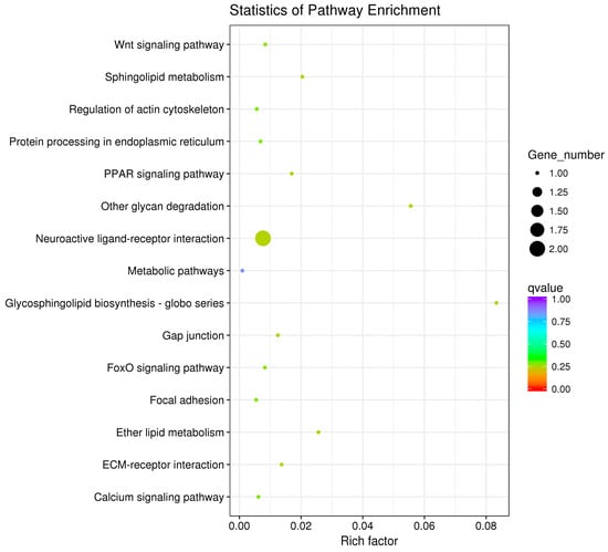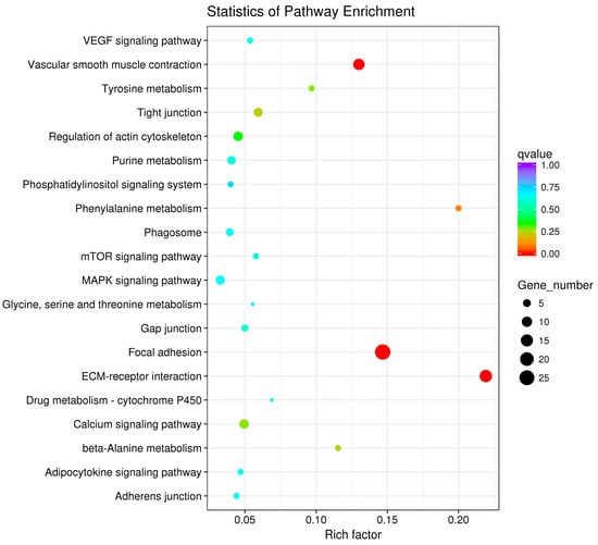 The pathway enrichment analysis was based on the KEGG database, and a hypergeometric test was used to identify pathways in which the differentially expressed genes were significantly enriched by comparing them with the reference genes of the whole genome. The enrichment analysis results are shown in Figure 7, Figure 8 and Figure 9. The hypothalamic differentially expressed genes were mainly enriched in terms of metabolic pathways, phagosome, sphingolipid metabolism, tight junction, gap junction, focal adhesion, and ECM-receptor interaction signaling pathway; the pituitary differentially expressed genes were mainly enriched in terms of neuroactive ligand-receptor interaction, sphingolipid metabolism, regulation of actin cytoskeleton, metabolic pathways, gap junction, focal adhesion, ECM-receptor interaction, and calcium signaling pathway, etc. The ovarian differentially expressed genes were mainly enriched in terms of focal adhesion, ECM-receptor interaction, vascular smooth muscle contraction, phagosome, tight junction, gap junction, regulation of actin cytoskeleton, calcium signaling pathway, and MAPK signaling Pathway, etc. The differentially expressed genes of the hypothalamus, pituitary gland, and ovary were all enriched in terms of gap junction, focal adhesion, ECM-receptor interaction signaling pathway, and the differentially expressed genes of both the pituitary and ovary were enriched in the calcium signaling pathway, indicating that these pathways played an important role in regulating egg production of Xinjiang Yili geese. Eleven differentially expressed genes were selected from the associated pathways, all of which were up-regulated genes. These genes are candidate genes related to the egg production of Xinjiang Yili geese (Table 3).