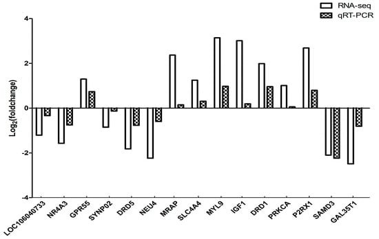 In order to validate the differentially expressed genes identified by the transcriptome sequencing, 15 genes were randomly selected and confirmed by qRT-PCR using beta-actin as the internal reference gene. The results showed that the expression trends of the 15 genes were consistent with those of transcriptome sequencing results. Therefore, the transcriptome sequencing results are reliable and can be further studied and analyzed (Figure 10).