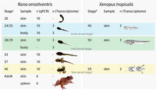 Overview of Rana ornativentris and Xenopus tropicalis samples used for qPCR and transcriptome analyses in this study. a R. ornativentris stage approximations based on Tahara [19,20]. b X. tropicalis stage approximations based on Nieuwkoop and Faber [23]. Full stage approximations in Table S1. Images of frogs in all figures are not to scale (source: Q. Lau for R. ornativentris, Nieuwkoop and Faber (1994) via Xenbase for X. tropicalis).