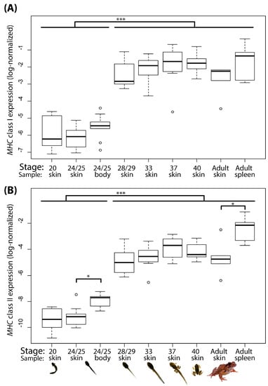 Boxplot of (A) MHC class I and (B) MHC class II expression in mRNA of Rana ornativentris tadpole skin during six ontological stages and other samples: stage 24/25 body, and adult skin and spleen. MHC expression values from qPCR were normalized by the GAPDH control gene and log-transformed for normality (log-normalized). * p < 0.05, *** p < 0.0001.