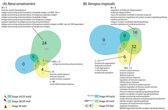 Venn diagrams of gene ontology (GO) terms enriched in skin of early- (E), mid- (M) and late- (L) larval stages from (A) Rana ornativentris and (B) Xenopus tropicalis. Number of immune-related enriched GO terms are in black (full list in Tables S5 and S6), and total number of enriched GO terms belonging to the ‘biological process’ parent category are in grey and also represented by circle sizes. Examples of enriched immune-related GO terms are listed in comparisons between stages (full list in Tables S5 and S6).