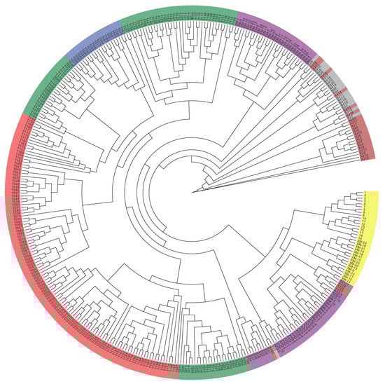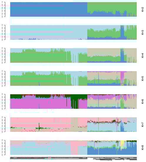A structural analysis was performed on the 366 samples. Each column in Figure 3 represents an individual, and the length of the different colored segments represents the proportion of an ancestor’s genome in the individual’s genome. K = 2–8 on the right side of Figure 3 indicates that 2–8 ancestral groups are assumed in this study. The abscissa of the picture indicates the name of the sample (the samples were sorted by group).