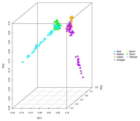 Principal component analysis (PCA) of 366 Bactrian camels. The sample population comprised four Chinese domestic breeds—the Alxa Bactrian camel (Alxa), the Junggar Bactrian camel (Junggar), the Sunite Bactrian camel (Sonid), and the Tarim Bactrian camel (Tarim)—and three Mongolian domestic breeds—the Galbiin Gobiin Ulaan Bactrian camel (Galbiin), the Haniin Hetsiin Huren Bactrian camel (Haniin), and the Tokhom Tongalag Bactrian camel (Tokhom).