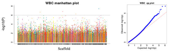 Manhattan plots and quantile–quantile (Q–Q) plots for white blood cell count (WBC). The left side of Figure 4 is the Manhattan map, which is the genetic marker effect value, i.e., the F-tested whole-genome p-value is sorted according to the physical position on the chromosome. The abscissa is the genomic coordinates, and the ordinate is −log10 (p-value). The smaller the p-value, the stronger the correlation, and the larger the ordinate. The horizontal dashed line in the Manhattan chart indicates the level of significance. When −log10 (p-value) > 6.26, the SNP is considered to be significantly associated with the trait.