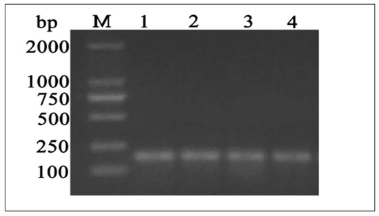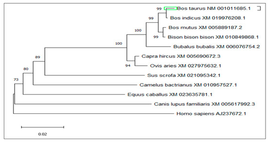 Based on sequence homology, PCR primers were used to amplify a single 187 bp PCR fragment (Figure 2). In y-c, a sequence length of 2600 bp covered the full coding region. MTHFR gene sequence analysis revealed a 1968 bp ORF, with the 5′ and 3′—terminal UTR (untranslated regions) corresponding to 192 bp (initiation codon) and 2159 bp (termination codon) respectively. A comparison of y-c coding sequence with other organisms showed the following similarities: Bos indicus, 99.51%; Bos mutus, 98.68%; Bubalus bubalis, 98.47%; Capra hircus, 96.20%; Ovis aries, 96.08%; Camelus bactrianus, 88.05%; Equus caballus, 88.86%; Canis lupus familiaris, 87.94%; Sus scrofa, 89.11%, and homo sapiens, 87.35%. Y-c MTHFR showed the highest homology with wild yak (Bos mutus) and the lowest with horse (Equus caballus). ORF analysis of y-c (Bos taurus) MTHFR sequence is shown in Figure S1.