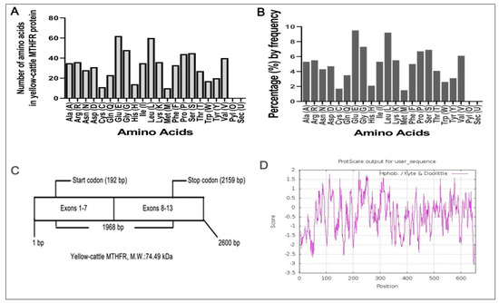 (A,B) Amino acid residues in yellow-cattle MTHFR protein, (C) Structure of MTHFR transcript, (D) Hydrophobicity analyses of the encoding product of yellow-cattle MTHFR protein.