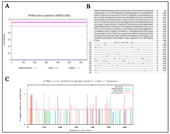 (A) Determination of transmembrane characteristics of yellow-cattle MTHFR, and (B,C) Phosphorylation sites in yellow-cattle MTHFR protein sequence.