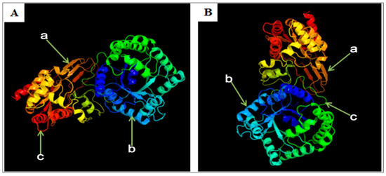 3D structure of MTHFR protein; (A) yellow-cattle MTHFR; (B) human MTHFR. a, extended strand; b, alpha-helix; c, random coil.