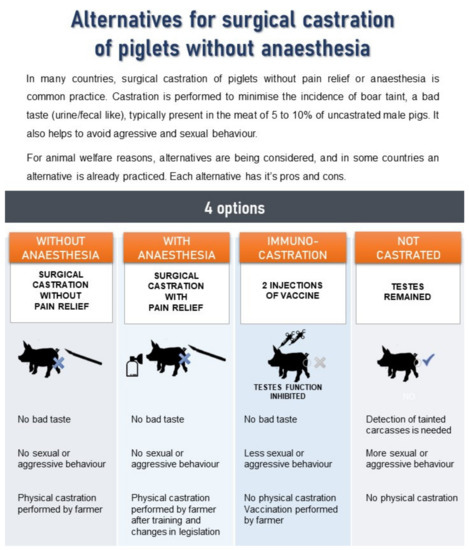 - CASTRUM Consortium. Pig Castration: Methods of Anaesthesia and Analgesia for All Pigs and Other Alternatives for Pigs Used in Traditional Products. Available online: https://www.boarsontheway.com/wp-content/uploads/2018/09/Castrum-study.pdf (accessed on 1 September 2020).