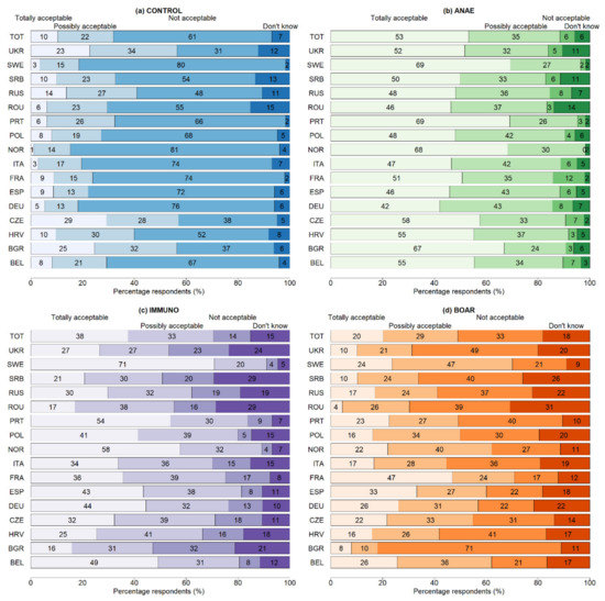 Acceptability of castration alternatives per country for (a) Castration without pain relief—CONTROL, (b) castration with anaesthesia—ANAE, (c) Immunocastration—IMMUNO, (d) no castration—BOAR. TOT—total sample.