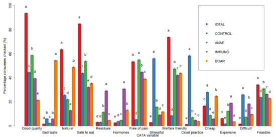 All 14 CATA terms were selected frequently by the respondents (>20%) for at least one of the alternatives, with the exception of “expensive” (Figure 4). Mainly “good quality”, “safe to eat”, “welfare friendly”, and “natural” were more frequently checked for IDEAL compared to each of the options (>60%). CONTROL had the highest frequency of “cruel practice”, “stressful”, and in a lesser extent also “difficult” and “cheap”. ANAE showed the highest frequency of “safe to eat”, “free of pain”, and “welfare friendly”. IMMUNO was mainly associated with higher frequencies for “welfare friendly”, and in a lesser extent also to “hormones”, “residues”, and “difficult”. BOAR was most associated with higher frequencies of “bad taste”, but also “natural”, “welfare friendly”, and “cheap”.