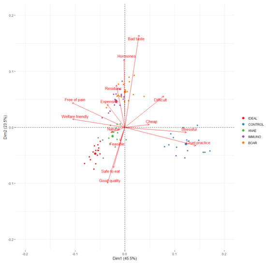 The same associations were observed within the correspondence analysis (Figure 5). The first axis (46%) differentiates CONTROL from the other three options and IDEAL based mainly on the terms related to animal welfare, i.e., “cruel practice”, “stressful” versus “welfare friendly” and “free of pain”. IDEAL is strongly associated with all the positive welfare characteristics and CONTROL with the negative ones, whilst the three alternatives are also more related to the positive welfare characteristics. The second axis (24%) allows further differentiation between IDEAL and the alternatives. IDEAL is mainly linked with “good quality” and “safe to eat” vs. BOAR opposite primarily due to its association with bad taste. IMMUNO is also, but less strongly, positioned on the same side as BOAR due to its association with “hormones”. Within the 4 options, ANAE and CONTROL are situated at the same side as IDEAL, but close to the origin, indicating that “food quality” and “food safety” are less determinant for these options.