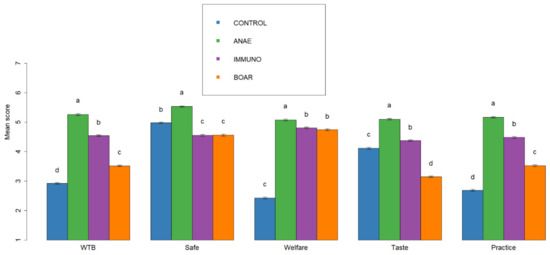 Overall level of agreement scored on a scale from 1 (totally disagree) to 7 (totally agree) towards different statements for the different castration alternatives “If the castration method was clearly labelled, I would surely buy…” (WTB), “I think that is totally safe to eat meat from …” (SAFE), “When I think about the following production method, it seems logical to me that animal welfare is best for …” (WELFARE), “If I consider the tastiness of meat, I prefer meat from…” (TASTE), ”I am completely convinced that this is the best option …” (BEST PRACTICE) for castration without pain relief—CONTROL, castration with anaesthesia—ANAE, Immunocastration — IMMUNO, and no castration—BOAR. a–d different superscripts indicate significant differences within statement variables per option (p < 0.05).