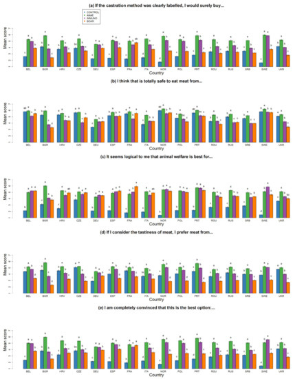 Overall level of agreement towards different statements for the different castration alternatives per country (a) “If the castration method was clearly labelled, I would surely buy…” (WTB), (b) “I think that is totally safe to eat meat from …” (SAFE), (c) “When I think about the following production method, it seems logical to me that animal welfare is best for …” (WELFARE), (d) “If I consider the tastiness of meat, I prefer meat from…” (TASTE), (e) ”I am completely convinced that this is the best option …” (BEST PRACTICE) for castration without pain relief—CONTROL, castration with anaesthesia—ANAE, Immunocastration—IMMUNO, and no castration—BOAR. a–d different superscripts indicate significant differences within countries per option (p < 0.05).