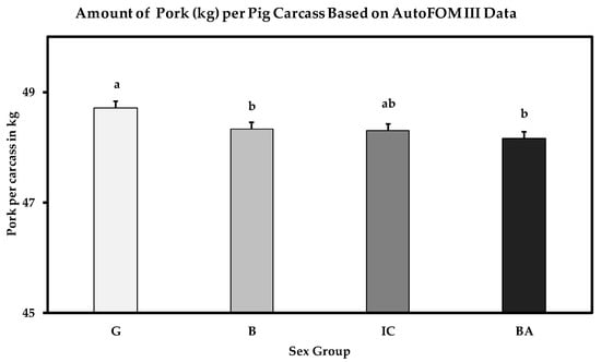 Amount of pork per carcass in kilograms from gilts (G; n = 15,226), boars (B; n = 16,922), immunocastrates (IC; n = 2815) and barrows (BA; n = 1977) based on AutoFOM III estimations (LSM ± SE). The amount of valuable pork (kg) between different sex groups with at least one identical letter shows no significant difference between them (p < 0.05).