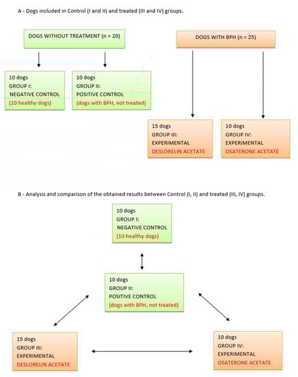 First, there were compared the results between Group I (negative control group) and Group II (positive control group), to identify any differences between healthy dogs and dogs with BPH. Secondly, results obtained in Group III and Group IV were compared to Group II, which served as a positive (untreated) control group, for both treatment groups (III and IV), to identify any differences between treated and not treated dogs with BPH. Lastly, the Groups III and IV were compared to each other to see any differences in the onset of clinical improvement, treatment efficiency, treatment duration, or observed adverse effects (Figure 2).