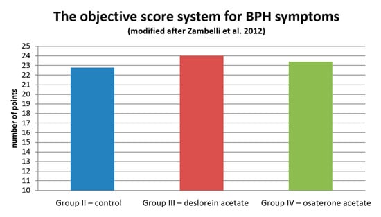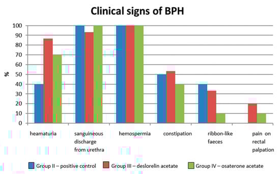 Benign prostatic hyperplasia (BPH) is the most common prostatic disease diagnosed in dogs. It is a spontaneous and age-related condition occurring in older dogs. Initially, it is often asymptomatic or with very mild, unnoticed clinical signs. Serious clinical problems develop with time, after a considerable progress of the disease []. All dogs enrolled in the presented clinical trial had clinical signs of BPH, which significantly reduced the patient’s quality of life. Similar to other authors [,,], in our study, we observed most often intermittent sanguineous discharge from prepuce or urethra without micturition, hemospermia, gross hematuria, and straining during defecation. The objective score system for the assessment of the severity of clinical symptoms [] used in our trial guaranteed the optimal patient selection for each group and provided the highest possible coherence among the treated groups. Moreover, it also allowed to highlight the differences among groups during the trial.