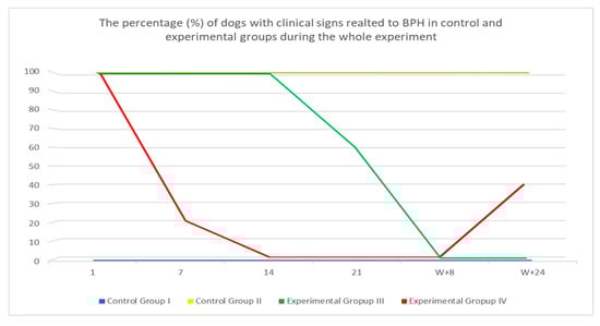Clinical symptoms were present in all dogs from Group II throughout the whole studied period with intermittent exacerbation of clinical signs in some of the dogs. In 40% (six dogs) of dogs from Group III, all symptoms subsided within the first 21 days after inserting the implant, whereas in the remaining 60% (9 dogs), symptoms subsided in week 8 (W + 8) after inserting the implant. In five dogs on D7, the flare-up effect was noted (aggravation of clinical signs, i.e., hematuria, sanguineous discharge from the prepuce, hemospermia, tenesmus, or constipation) and in two of these dogs, it was still present on D14 (these dogs have the most severe BPH symptoms from all the dogs that entered the trial). In Group IV, 80% of treated dogs showed no symptoms on D7 after starting the therapy, while the remaining 20% had no symptoms on D14. However, four dogs (40%) in Group IV showed signs of relapse, i.e., clinical signs recurrence in W + 24 of the study (Figure 4)