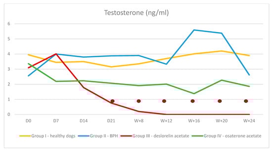 Our results were the same as those already published and confirmed that DA leads to a progressive atrophy of Leydig cells and testicular down regulation with the subsequent decrease in serum testosterone levels, which became undetectable around week 8 of the therapy. Since testicles are the only source of the testosterone in the body, the low serum testosterone levels directly indicate their function. [,,,]. On the contrary, the reports on the influence of OA on the serum testosterone levels are inconsistent. Murakoshi et al. [] documented that OA has no effect on Leydig cells, thus the serum testosterone levels should remain stable during treatment. However, in the same paper, Murakoshi et al. [] reported a transient decline in testosterone level during OA treatment. Same findings regarding testosterone drop were also reported by Tsutsui et al. [,]. Moreover, the serum levels of testosterone were lower in groups of dogs receiving higher OA doses (exceeding manufacturer recommendations, > 1 mg/kg BW) []. In our trial, we also observed a slight drop in testosterone levels, insignificant comparing to D0 values within the same group of investigated dogs, but in W + 8, significantly lower comparing to the both control group (Group I and II). Hence, although subtle, the antiandrogenic effect of OA cannot be fully excluded [], but as found by other authors, it did not impair the process of spermatogenesis [,].