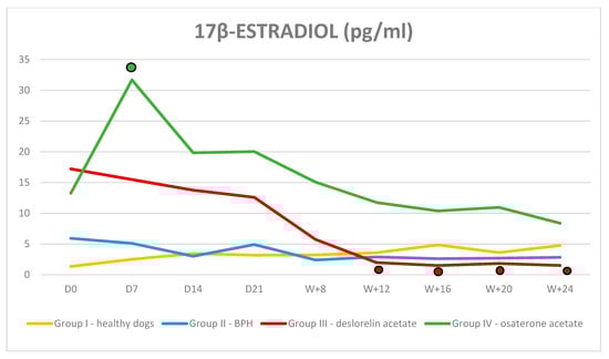 Both the serum 17β-estradiol and testosterone levels in all dogs from Group I and II were within normal limits and did not change significantly throughout the trial. In Group III and IV the serum testosterone and 17β-estradiol levels were normal at the beginning of the trial and decreased gradually during treatment. Testosterone: In Group III after a transient rise on D7 testosterone was decreasing to non-detectable values in 40% of dogs in W8 and in all dogs in W16. The significant reduction was observed on D14 in comparison to Group II and on D21 in comparison to D0, and the quickest decrease was noted between D7–D14. In Group IV, the lowest testosterone level was observed in W + 16, however no difference was noted comparing to the initial testosterone levels in this group and, compared to the control Group II, the significantly lower testosterone levels was detected in W + 5 (Figure 5). 17β-estradiol: in Group III, a significant reduction was noted in W + 12 of the therapy and was still decreasing until the end of the trial. In Group IV, after the initial increase comparing the initial value and Group II value (31.69 pg/mL ± 14.8 vs. 13.26 pg/mL ± 10.6; p = 0.008), thereafter the 17β-estradiol levels decreased and reached values similar to D0 (Figure 6).