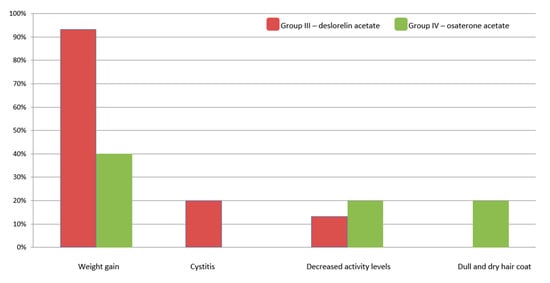 In two dogs from Group III, we observed the lower activity levels in W + 8 and in three dogs (in one on D7 and in two on D21) clinical symptoms of cystitis (incontinence, dysuria, or stranguria), which were resolved on symptomatic treatment (antibiotics and non-steroidal anti-inflammatory drugs) within one week. In Group IV, lower activity levels were also noted in two dogs (D14) and transient molting and dull hair coat were reported by owners in two dogs in W + 12 and W + 16, respectively. The above fur problems have settled quickly, as they were not mentioned again in the following questionnaires by the owners. In some patients from this group (IV), incidental gastro-intestinal symptoms or occasional polyuria and polydipsia were also seen (Figure 7).