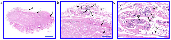 The porcine buccal tissue samples stained with hematoxylin and eosin (H&E) method. (a) lamina propria of the mucosa, fascia and buccal muscle, scale bar length: 2000 µm, (b) lamina propria of the mucosa, fascia and buccal muscle, scale bar length: 500 µm, (c) lamina propria of the mucosa, scale bar length: 200 µm. 1—lamina propria of the mucosa, 2—dense connective tissue of fascia, 3—skeletal muscle, 4—dense connective tissue of mucosa, 5—adipose tissue, 6—loose connective tissue, 7—blood vessels, 8—arterioles, 9—venules, 10—circulatory anastomoses.