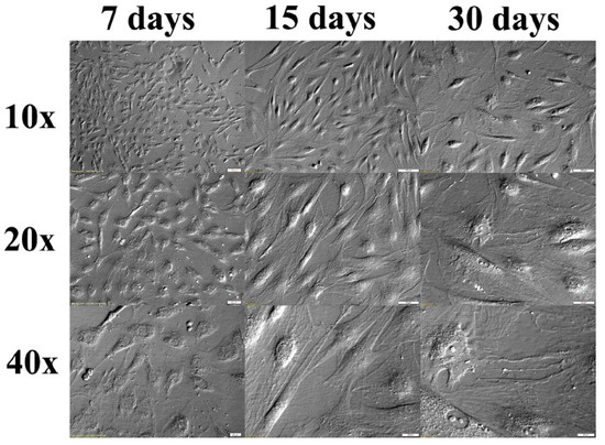 The cells for one in vitro culture were pooled from tissue acquired from 10 pigs. The isolated cells were seeded at a density of 2 × 104 cells/cm2 and the viability was not less than 90%. The oral fibroblasts were cultured at 37 °C in a humidified atmosphere of 5% CO2. The culture medium was changed every three days. Cells were passaged when they attained 70–80% confluency. Before the collection of cells for the analyzed samples, photos of the culture were taken to observe the possible changes of morphology. Observations were documented at three-time points: 7 days, 15 days, and 30 days (Figure 2). For further experiments, 5 in vitro cultures were performed. Cells from two cultures were used for microarray analysis and cells from three cultures were used for Quantitative Reverse Transcription PCR (RT-qPCR).