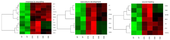 Among these genes, genes from wound healing, response to wounding and vasculature development GO groups were extracted by DAVID (Database for Annotation, Visualization and Integrated Discovery) software. These sets of genes were subjected to a hierarchical clusterization procedure and presented as heatmaps (Figure 3 and Figure 4). The differently expressed genes that are divided between those GO terms are presented in Figure 5 and Table 2. In the Supplementary Materials, all of the differentially expressed genes are presented in a table (Table S1) and table with a list of all ontological groups obtained during the microarray analysis (Table S2)