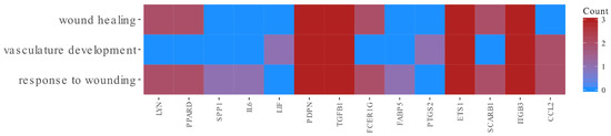 Heatmap showing the gene occurrence wound healing, vasculature development and response to wounding GO terms. The presented count value means the number of gene occurrence in the analyzed GO terms.