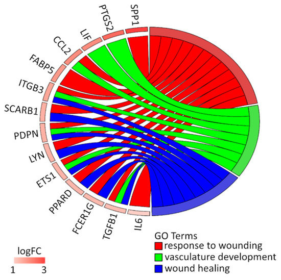The correlation between differentially expressed genes that belongs to the wound healing (blue ribbon), response to wounding (red ribbon) and vascular development (green ribbon) GO terms. The ribbons join categories with the genes shared with each other. The genes were sorted by log2(fold change) from most to least changed gene.