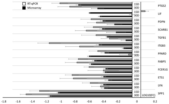 Graphic representation of RT-qPCR validation for selected genes that were included in the microarray analysis. The presented data were compared to the 7th-day of in vitro culture. Presented data are ±SD of values obtained from n = 2 (microarray: black bars) and n = 3 (RT-qPCR: white bars) of biological replicates.