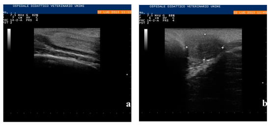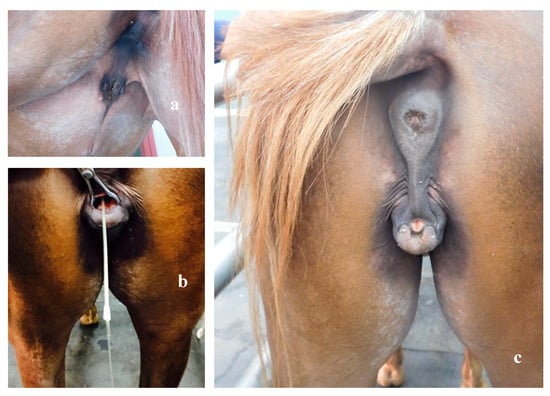 During urination, the animal assumed the typical attitude of the mare (lifting of the tail and spreading of the hind limbs). At the time of the visit, the mare was in good health and nutrition; upon inspection, it was possible to highlight the presence of the mammary glands in the groin region (Figure 1a). The animal showed an abnormal anus–genital distance, vulvar lips fused dorsally, with the exception of the lower commissure, which ended blindly, from which protruded a structure similar to a glans (Figure 1b).