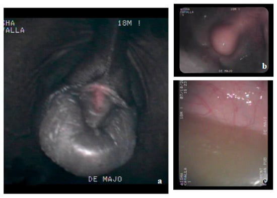 By means of flexible video endoscope of 10 mm in diameter, connected to a processor integrated into the Pentax insufflation system (EPK 1000 Pentax, Milan, Italy) and dorsally inserted to the glans (Figure 2a), the internal urethral orifice, urethral meathus, and bladder (Figure 2b,c) were identified. Before ending the endoscopic examination, biopsy samples were taken along the entire route.