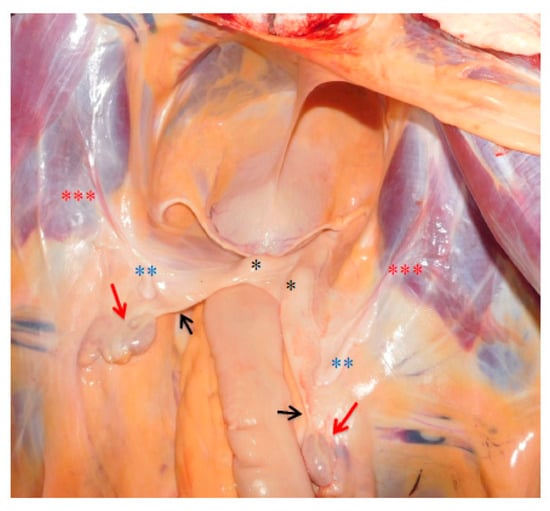 Anatomopathological examination: gonads (red arrows →) connected to the apex of the uterine horns by a cord-like structure (black arrows →). Hypoplastic horns and corpus of the uterus (black asterisk *). Two bilateral sacciform structures (blue asterisks **), located between the gonads and the uterine horns, on the lateral band of the wide ligament in caudoventral direction (red asterisks ***), up to the internal inguinal ring (a typical characteristic of the cremaster muscle).