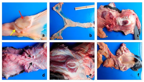 Anatomopathological examination. (a) Section of gonad (appearance to testicular parenchyma (red arrow →)), absence of the mediastinum and ausent follicular structure. Tubular-like structure in cranial area partially circumscribed the gonad (yellow arrow →). (b) Uterine horns (6 cm) and uterine body (15 cm) and cervix (3 cm). In the longitudinal section, the longitudinal folds of the endometrium are visible. (c) Typical structures of the corpora cavernosa. (d) Retractor muscles of the penis (black arrows). (e) Ischiocavernous muscle and bulbourethral glands (2 cm; blue arrow →). (f) The opening performed on fused vulvar lips led directly to the dilated pelvic urethra, helping us to locate the vaginal ostium of the cervix.