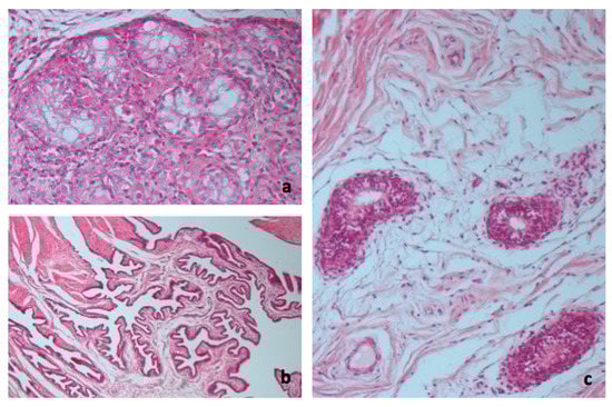 Histological examination. (a) Hypoplastic or atrophic seminiferous tubules, with thickening and hyalinization of the basement membrane and the presence of Sertoli cells. Complete absence of germinal epithelium. Leydig cells in the interstice with acidophilic cytoplasm (hematoxylon–eosin; ×250). (b) Infundibular portion of the salpinge at the level of the cranial pole of the gonads (hematoxylin–eosin; ×250). (c) Tubular structures covered with ciliated epithelium, referable to the epididymis or sketches of epoophoron or paroophoron (epididymis; hematoxylin–eosin; ×250).