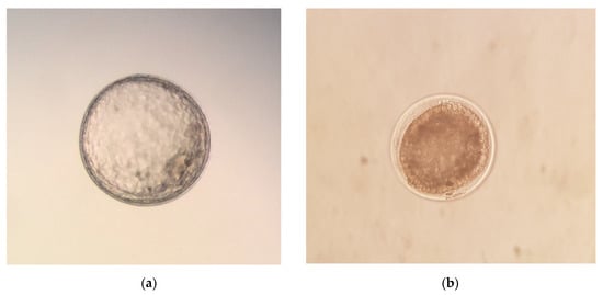 17] for donkeys. After the flushing, luprostiol was administered to donors to induce luteolysis. Recovered embryos were evaluated for developmental stage (morula, early blastocyst, blastocyst, or expanded blastocyst) and morphological quality, and they were graded on a scale of 1–4 [