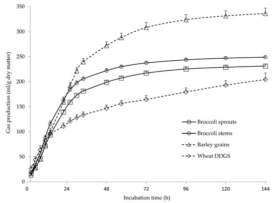 Gas production kinetics of broccoli sprouts, broccoli stems, barley grains and wheat DGGS (dried distilled grains with solubles). The bars indicate the standard error of the mean (n = 12 for broccoli samples, and n = 4 for barley grains and wheat DDGS).
