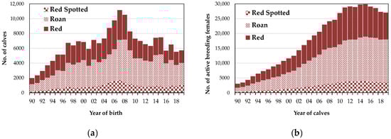 - Cañas-Álvarez, J.J.; Gónzalez-Rodríguez, D.; Martín-Collado, D.; Avilés, C.; Altarriba, J.; Baro, J.A.; De la Fuente, L.F.; Díaz, C.; Molina, A.; Varona, L.; et al. Monitoring changes in the demographic and genealogical structure of the main Spanish local beef breeds. J. Anim. Sci. 2014, 92, 4364–4374. [Google Scholar] [CrossRef]
