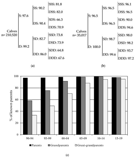 - Hinrichs, D.; Thaller, G. Pedigree analysis and inbreeding effects on calving traits in large dairy herds in Germany. J. Dairy Sci. 2011, 94, 4726–4733. [Google Scholar] [CrossRef]