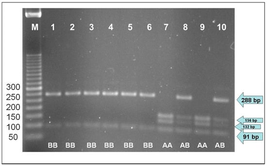 PCR-RFLP genotyping at bovine CSN3. Lane M: marker; lanes 1 to 6: genotype BB, Sardo-Modicana cattle breed; lanes 7 and 8: genotypes AA and AB, Sarda cattle breed; lanes 9 and 10: genotypes AA and AB, Sardo-Bruna cattle breed.