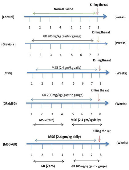 Fifty Wistar male rats ten weeks of age average (179 ± 1 g) were purchased from the Egyptian Institute for Vaccine and Serological Production, Helwan, Egypt and were housed in the animal house of the Department of Physiology, Faculty of Veterinary, Kafrelsheikh University. They were maintained under standard laboratory conditions with a 12 h light/dark cycle and free access to food pellets and tap water ad libitum. After two weeks of acclimatization, the rats were randomly allocated into five groups as seen in Figure 1: control (received normal saline (0.9%) with the same procedure and volume as Graviola-treated groups, orally once daily for eight weeks), Graviola (orally administrated Graviola extract (GE) at 200 mg/kg BW daily for 8 weeks), and Graviola dry extract was dissolved in normal saline (0.9%) and administered daily with 200 mg extract/kg BW using gavage needles. The selected dose of aqueous Graviola extract (GE) was according to the previous study of [26,27], MSG (orally administrated 15% of LD50 of MSG, 2.4 gm/kg daily for 8 weeks) according to [8], Graviola + monosodium glutamate (MSG + GR; received GE, 200 mg/kg/day once daily orally four weeks, then concomitant with MSG 2.4 gm/kg BW for next four weeks), and monosodium glutamate + Graviola (orally administered MSG only (2.4 gm/kg BW) daily for four weeks, then concomitant with GE (200 mg/kg BW) daily for next four weeks. All treatments were initiated and continued for eight weeks with a basal diet [28,29]. The body weight and food intake were daily recorded.