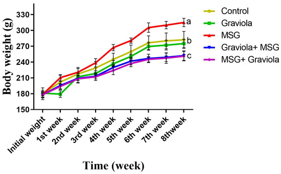 At the end of the experiment (56 days), body weight was found to increase significantly in the MSG-treated group compared to the control group (p < 0.05). There was a significant decrease in body weight in rats orally administered MSG + GE and GE + MSG compared to the MSG-treated group.Concerning control one, there were no significant shifts with the Graviola treatment. (Figure 2).