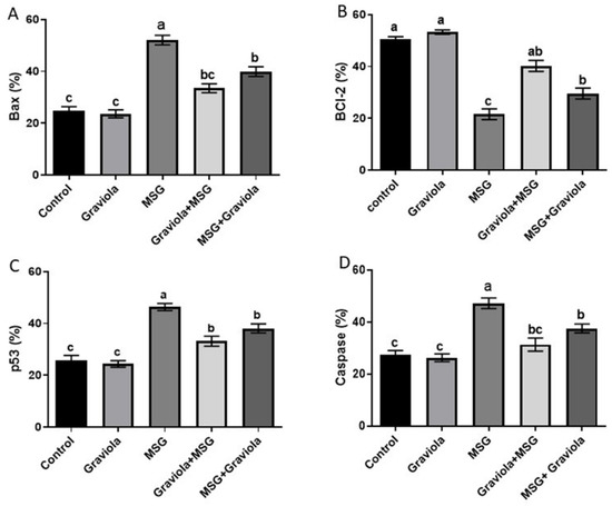 Flow cytometric analysis was conducted to examine Graviola’s antiapoptotic effects on apoptosis in liver cells induced by MSG. The p53, caspase-3, and Bax levels of the MSG group were significantly higher than the control group (p < 0.05). Besides, the oral administration of GE (200 mg/kg BW) to the rat groups MSG + GE and GE + MSG resulted in a significant decrease in their expression levels compared to the MSG group. Additionally, GE administration showed no statistically significant difference from the control group, as shown in Figure 3. Conversely, the Graviola-treated group showed normalization to the BCL-2 level, which was significantly decreased by MSG administration. Please see the Figures S1–S4.
