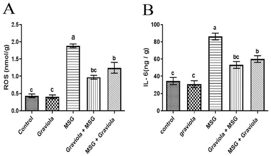There was a significant increase (p < 0.05) in ROS and IL-6 levels in the MSG group compared to the control group. Additionally, both MSG + GE and GE + MSG showed a significant decrease in ROS and IL-6 levels, whereas the Graviola administration alone had no significant difference from the control group, as shown in Figure 4.
