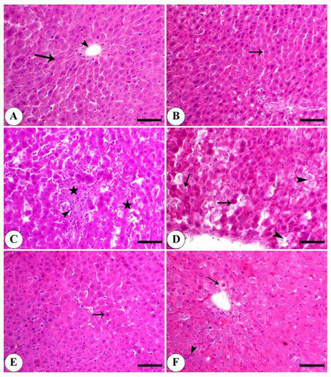Photomicrograph of the liver of the control and differently treated groups of animals. (A) Control showing normal hepatocytes (arrow) arranged in cords around the central vein (arrowhead). (B) Graviola is showing normal hepatocytes arranged in cords separated by blood sinusoids (arrow). (C) MSG showing periportal hepatic necrosis (astars) associated with mononuclear cell infiltration (arrowhead). (D) MSG is showing single-cell necrosis (arrow) with a loss of cellular details and nuclei of some hepatocytes (arrowhead). (E) Graviola + MSG is showing a few pyknotic nuclei (arrow) and a mild degree of hepatocyte degeneration (arrowhead). (F) MSG + Graviola showing limited centrilobular hepatic vacuolation (arrow) and mononuclear cell infiltration (arrowhead). Stained with hematoxylin and eosin (H & E), scale bar = 50 µm.