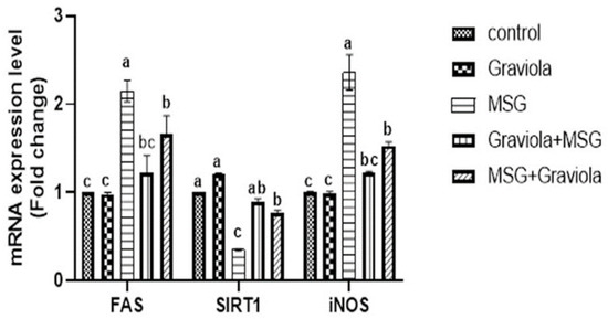 As shown in Figure 6, the relative ratio of hepatic SIRT1 gene expression was significantly reduced in the MSG-treated group, and the comparable rate of SIRT1 gene expression was improved considerably in Graviola-treated rats. FAS gene expression with MSG treatment was upregulated considerably, showing significant downregulation with the Graviola treatment. Compared to the control group, the relative expression of the hepatic iNOS in rats treated with MSG gene expressions were markedly upregulated and significantly downregulated in rats treated with Graviola compared to rats treated with MSG.