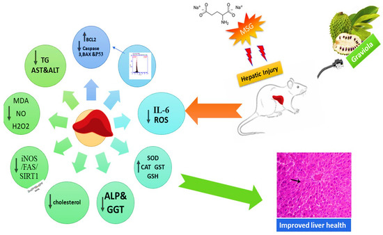 Currently, there is a substantial increase in the use of food additives. Organic compounds are deliberately added to food in small quantities during the production process to improve the organoleptic quality of foods, such as flavor, color, taste, appearance, and texture [3]. Food additives can instantly be harmful or be long-lasting if they are continuously consumed. Immediate effects may include headaches, changes in energy levels, mental concentration and behavior changes, and immune response [56]. One of those food additives widely used as an enhancer of flavor is monosodium glutamate (MSG). It is a glutamic acid salt amino acid [1]. This encourages us to search for a natural food additive, such as Graviola, that could offset the oxidative and inflammatory processes induced by MSG in hepatic tissues. Our data revealed that MSG causes a significant increase in body weight. This increase may be attributed to the fact that MSG can improve foods’ palatability by having a favorable effect on the appetite center [57] and enhancing the chemosensory perception [58]. Increased IL-6, resistin, and tumor necrosis factors in adipose tissues are the primary effects of MSG on body weight. The elevated serum levels of resistin and insulin can deteriorate the visceral adipose tissue [59]. Additionally, the ingestion of MSG has a local effect. It activates the celiac and gastric branches of the vagus nerve when found in the gastrointestinal tract, causing the activation of limbic, hypothalamus, insular cortex and nucleus tracts, and solitary tracts, which eat many foods [60]. An oral administration of Graviola normalized the body weight, and these findings are in agreement with [61,62,63]. The decrease in triglyceride and overall cholesterol is attributed to this, since Graviola has a hypolipidemic effect and hypolipidemic agents such as tannins, which reduce the cholesterol absorption and, consequently, reduce the body weight gain [64,65]. The lipid profile, including total cholesterol (TC), triglyceride (TG), and LDL-C, increased significantly in the serum of rats administered MSG. At the same time, the HDL-C content was reduced, as shown in Table 3; this result was inconsistence with [66,67], who reported that MSG could increase the activity of coenzyme A (HMG CoA) reductase, 3-hydroxyl-3-methylglutaryl, the limiting factor of cholesterol biosynthesis, which results in increased cholesterol synthesis and hyperlipidemia, with increased serum TG and TC, shifting the glucose metabolism towards lipogenesis. The prophylactic and protective roles of orally administered Graviola in normalized parameters of the lipid profile, as shown in Table 3, could be attributed to the involvement of hypolipidemic agents in the GE [62,63]. The hypolipidemic and antioxidant effects of Graviola due to the presence of agents such as tannins and other polyphenolic compounds cause decreasing cholesterol absorption by deactivating coenzyme-A (HMG-CoA) reductase hydroxymethylglutaryl [65]. Our findings showed that MSG can significantly increase the liver enzymes ALT, AST, ALP, and GGT due to the cytotoxic effect of MSG, which resulted in damage to liver cells and canaculae and the release of these enzymes in the circulation [68]. Moreover, MSG toxicity creates ammonium ions that cause hepatic toxicity through the formation of ROS that react with polyunsaturated fatty acids contained within cell membranes that cause plasma and mitochondrial membranes to deteriorate with the release of hepatic enzymes [69] via preserving the structural integrity of the hepatic cell membrane or regenerating damaged liver cells [70]. Graviola preserves and prevents the leakage of the intracellular enzyme70 liver injury triggered by MSG Graviola [71], which supports our finding of the protective role of Graviola. Our research reaffirmed that MSG has harmful effects on hematological parameters, with characteristic leukopenia consistent with [72,73] attributed to RBCs’ short half-life due to the hemolytic effect of MSG. This may be due to the atrophy induced by MSG in the gastric mucosa (gastritis) as the L-form of glutamic acid is acidic, resulting in a reduction in intrinsic factor synthesis leading to vitamin B12 malabsorption, which is the main cause of anemia [74]. MSG caused leukopenia, which was in the same line as [75], who attributed this effect to the immune-suppressant effect of MSG due to MSG’s hazardous effects on the thymus and spleen. Graviola significantly cured the adverse impact of MSG. The obtained result was in the same line with [76], who attributed this finding to Graviola’s ability to restore body fluids and stimulate erythropoietin [77]. Orally administered MSG led to increased oxidative stress markers, such as MDA, ROS, NO, and H2O2, and decreased SOD, CAT, GST, and GSH that supported this finding by [9,68,78,79,80,81] as a result of the exhaustion of SOD and accumulation of H2O2 as a result of ROS formation as a result of MSG. Besides [9], this effect is revealed to MSG lipogenesis characters that consume nicotinamide adenine dinucleotide (NAD) + hydrogen (H) (NADH). Similarly, the conversion of the majority of GSH in the liver to glutathione disulfide (GSSG) by the glutathione reductase enzyme to protect the liver cells from toxic material damage decreased the GSH level. The elevated levels of MDA and NO return to the difficulty of glutamate transportation across the cell membrane, which initiate lipid peroxidation (LPO) and alter the cell redox state [82], leading to membrane damage [83]. Graviola administration normalized the oxidant status of the liver cells, this result being in harmony with [43] due to Graviola antioxidant activity [84]. Graviola has a protective role against free radicals (OH) and H2O2 [85]. Therefore, it stopped the elevation of LPO [86] and converted the ROS to nontoxic or dangerous goods [87]. Graviola possesses potent antioxidant properties due to the presence of acetogenins, which can p