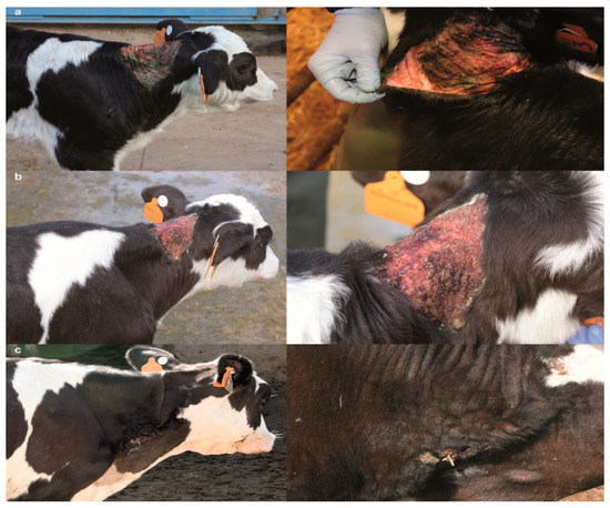 Neck skin lesions of the classical Ehlers–Danlos syndrome (cEDS)-affected Holstein calf. (a) Calf age = 3 days: severe, extensive ulceration secondary to minor trauma; note the spontaneous detachment of the skin from the subcutaneous tissue. (b) Calf age = 29 days: atrophic scarring; note the scabby and crustose wound with the edges firmly embedded in the subcutaneous tissue. (c) Calf age = 7 months: papyraceous scars and cutis laxa.