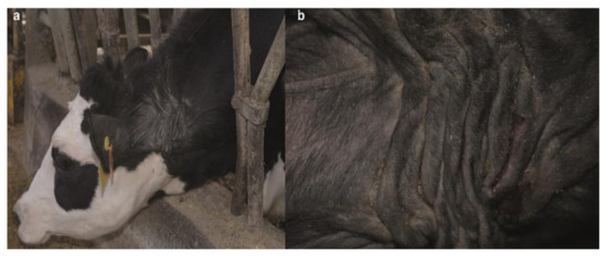 Examination of the dam revealed multiple wrinkles, folds, papyraceous scars, cutis laxa, and hyperextensibility of the neck skin (Figure 2a,b). Moreover, its maternal-grandmother showed milder skin lesions in the ventral part of the neck at the level of the larynx, characterized by the presence of bald areas and scabs (Figure S1).